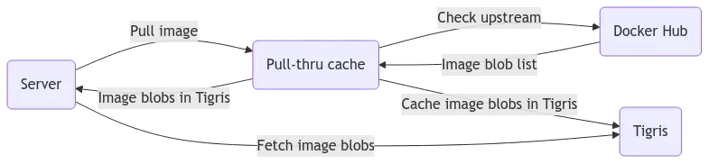 This lets you continue using the Docker Hub as normal, but you don’t need to authenticate every server with an account. When you store your cached images in Tigris, you also can take advantage of Tigris’ global architecture to make sure that the images are as close to your servers as possible.